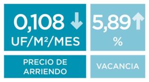 El segundo semestre del año se observa una reducción del 40% de la superficie disponible, respecto al periodo anterior. Cerrando en una vacancia del 5,89%, siendo las bodegas clase B las que más demanda presentaron. Con respecto a los precios de renta para éste mercado de bodegas, cerraron con un valor de 0,108 UF/m².