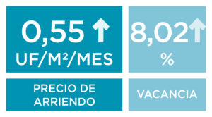 Con respecto al precio de arriendo, se registra un descenso trimestral llegando a 0,55 UF/m², en parte debido a la baja actividad en el arriendo de oficina de manera generalizada y a la baja de precios intencionada en submercados.