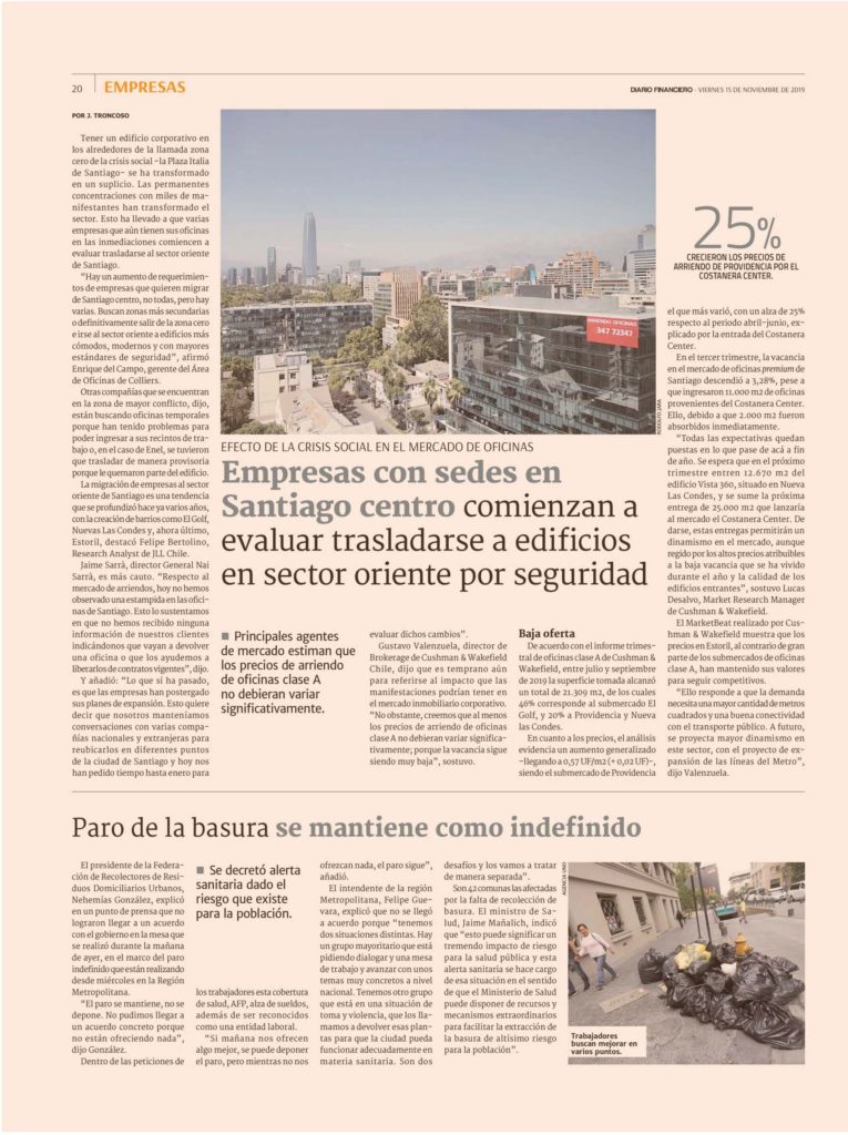 ‘Hay un aumento de requerimientos de empresas que quieren migrar de Santiago centro, no todas, pero hay varias. Buscan zonas más secundarias o definitivamente salir de la zona cero e irse al sector oriente a edificios más cómodos, modernos y con mayores estándares de seguridad’, afirmó Enrique del Campo, gerente del Área de Oficinas de Colliers. Otras compañías que se encuentran en la zona de mayor conflicto, dijo, están buscando oficinas temporales porque han tenido problemas para poder ingresar a sus recintos de trabajo o, en el caso de Enel, se tuvieron que trasladar de manera provisoria porque le quemaron parte del edificio.