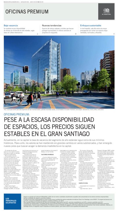 El mercado de oficinas premium en la capital muestra cifras que lo hacen un mercado singular en Sudamérica. De acuerdo a cifras de Cushman & Wakefield, a nivel regional, durante el primer semestre del año el mercado de oficinas premium de Santiago presentó la tasa más baja en términos de vacancia (3,7%), como resultado de un período de cinco años con escasa producción y de grandes desarrollos que permanecen a la espera.