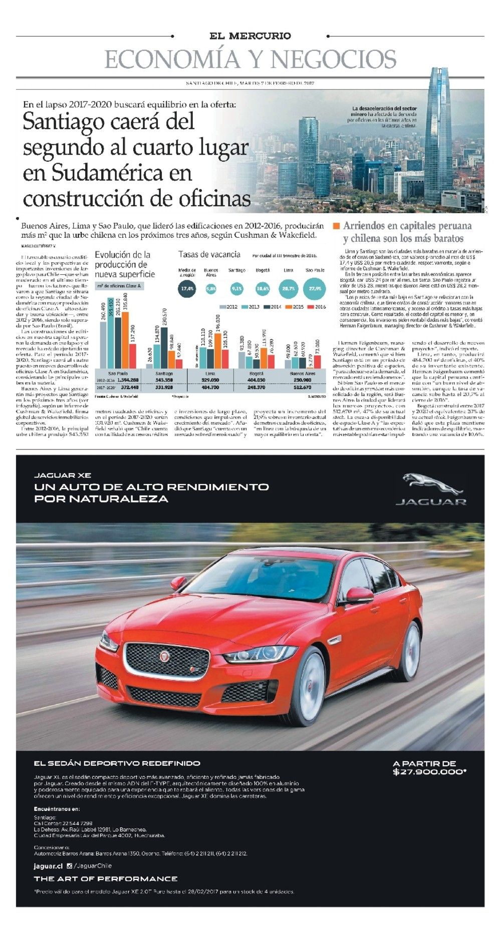 Santiago caerá del segundo al cuarto lugar en Sudamérica en construcción de oficinas. Cushman Wakefield2020-07-23T15:10:04-03:0007-02-2017| Fuente: El Mercurio.