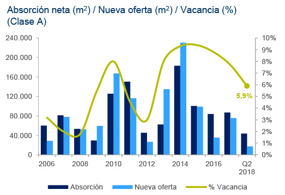 En el segundo trimestre el sector alcanzó un 5,9% de vacancia, registrando su menor nivel en los últimos seis años, situación que obedece a un escenario de escasa producción, con una ausencia de nuevas superficies, y donde la construcción de nuevos edificios se encuentra por debajo del promedio de los últimos cinco años. En términos de superficie, se observó un descenso del 8,8% respecto del trimestre anterior.